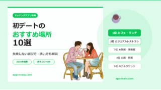 マッチングアプリの初デートにおすすめの場所を徹底解説。男女別アンケートで判明した人気スポットランキング・場所選びの5つのポイント・絶対避けるべきNGスポット・デートに誘う例文・当日の会話術・デート後に2回目につなげる方法まで完全網羅。初デートを成功させたい方は必読です。
