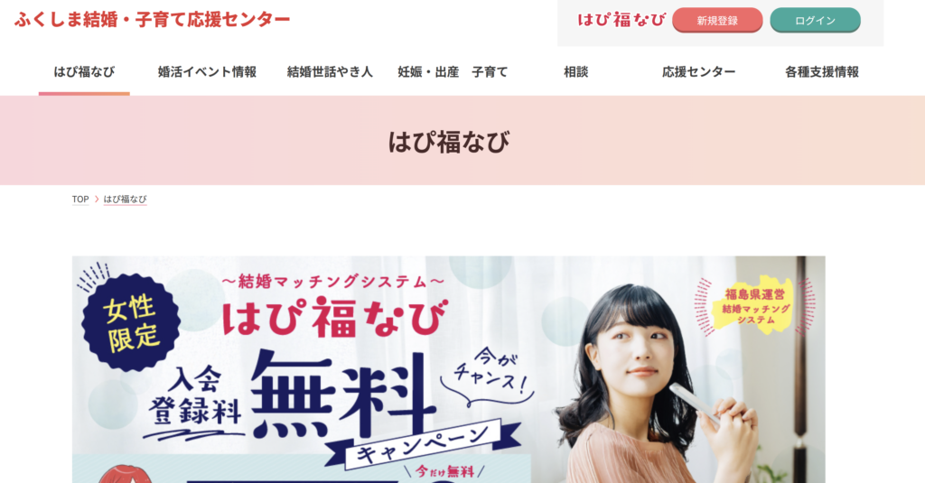 郡山市公式の婚活支援事業ページによると、郡山市は福島県が運営する公式マッチングシステム「はぴ福なび(ふくしま結婚マッチングシステム)」の登録料補助を実施しています。