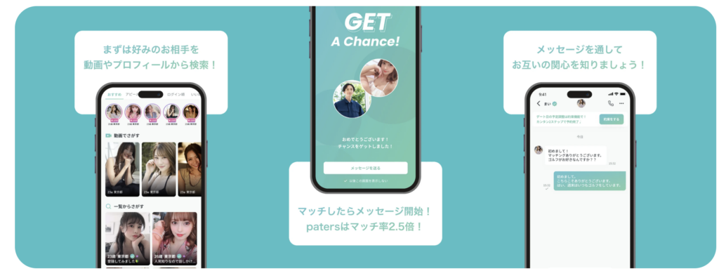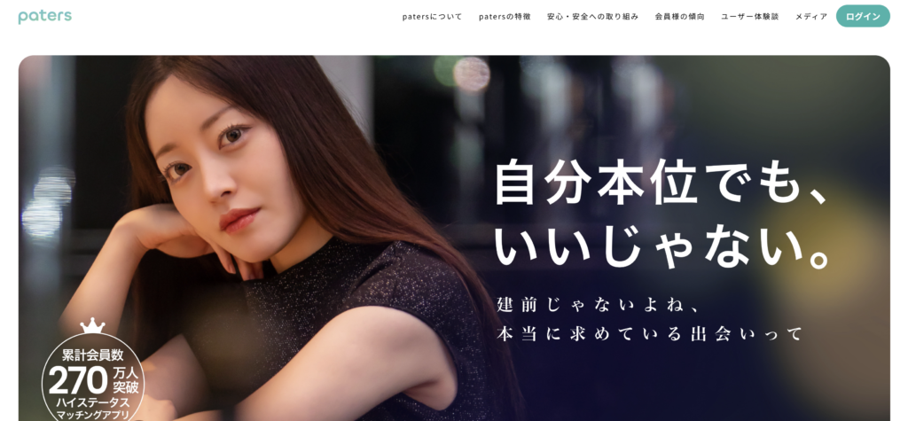 paters(ペイターズ)は、国内最大級の会員数・目的別マッチング・即会い機能・充実した安全対策を兼ね備えた、本気で出会いを求める方にぴったりのマッチングアプリです。